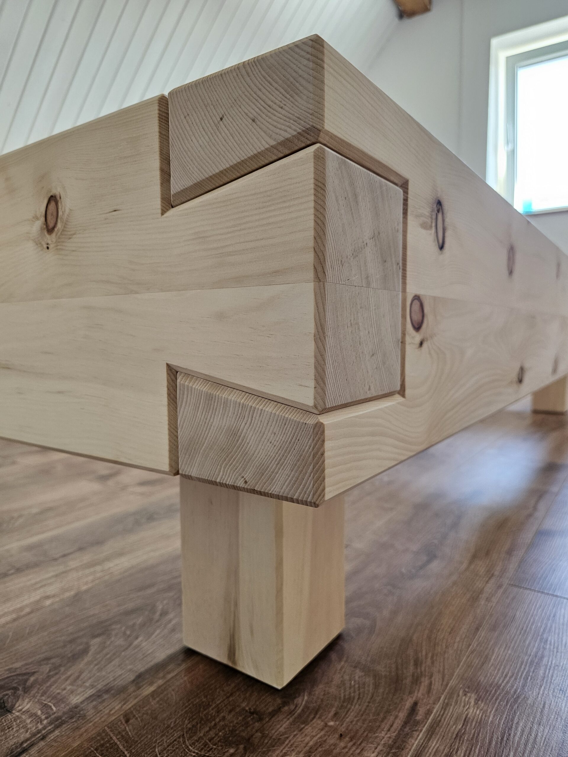 Zerlegbares Balkenbett aus massiver Zirbelkiefer, mit handgestemmten Schwalbenschwanz Eckverbindungen, Oberfläche geseift.