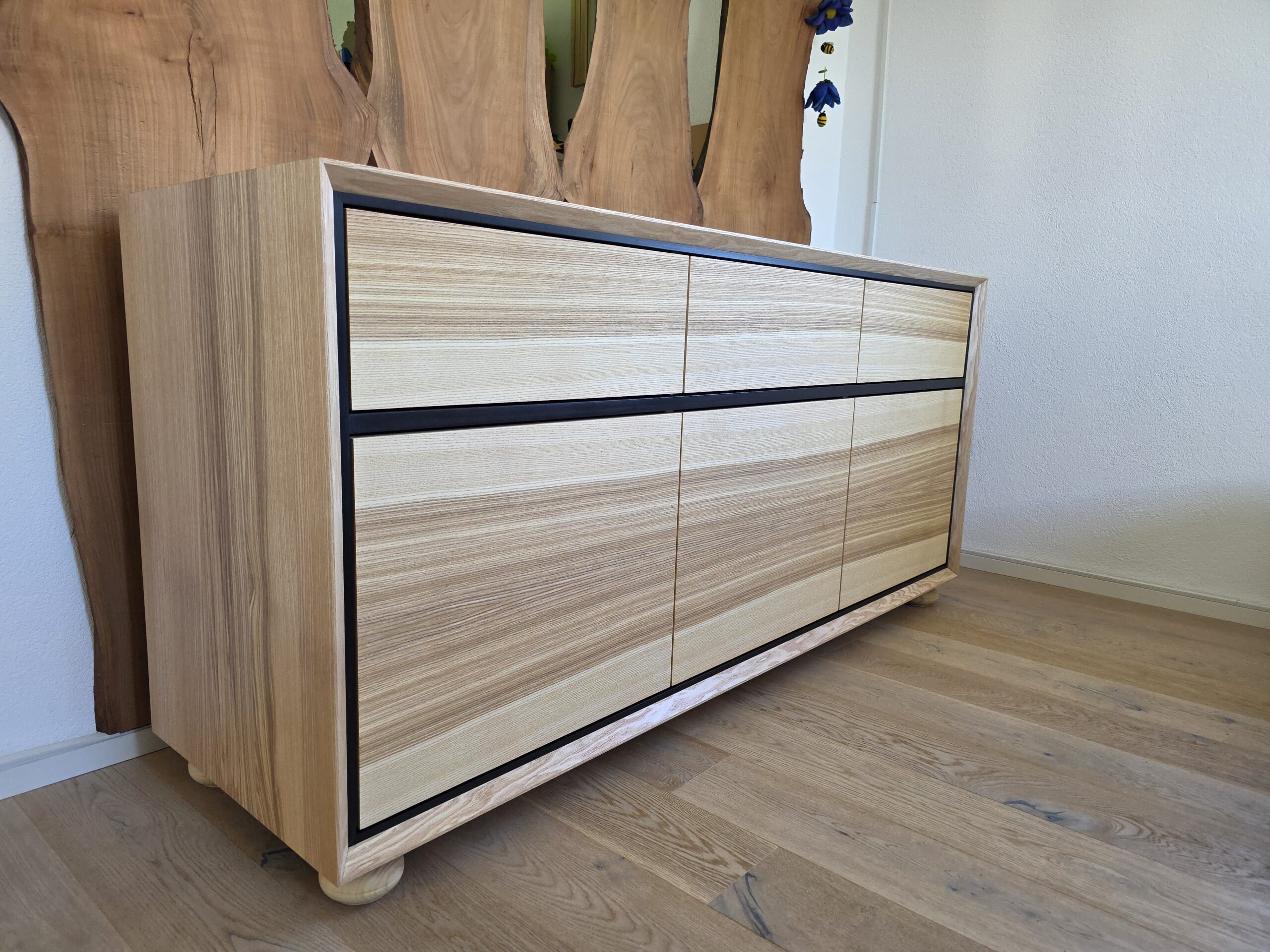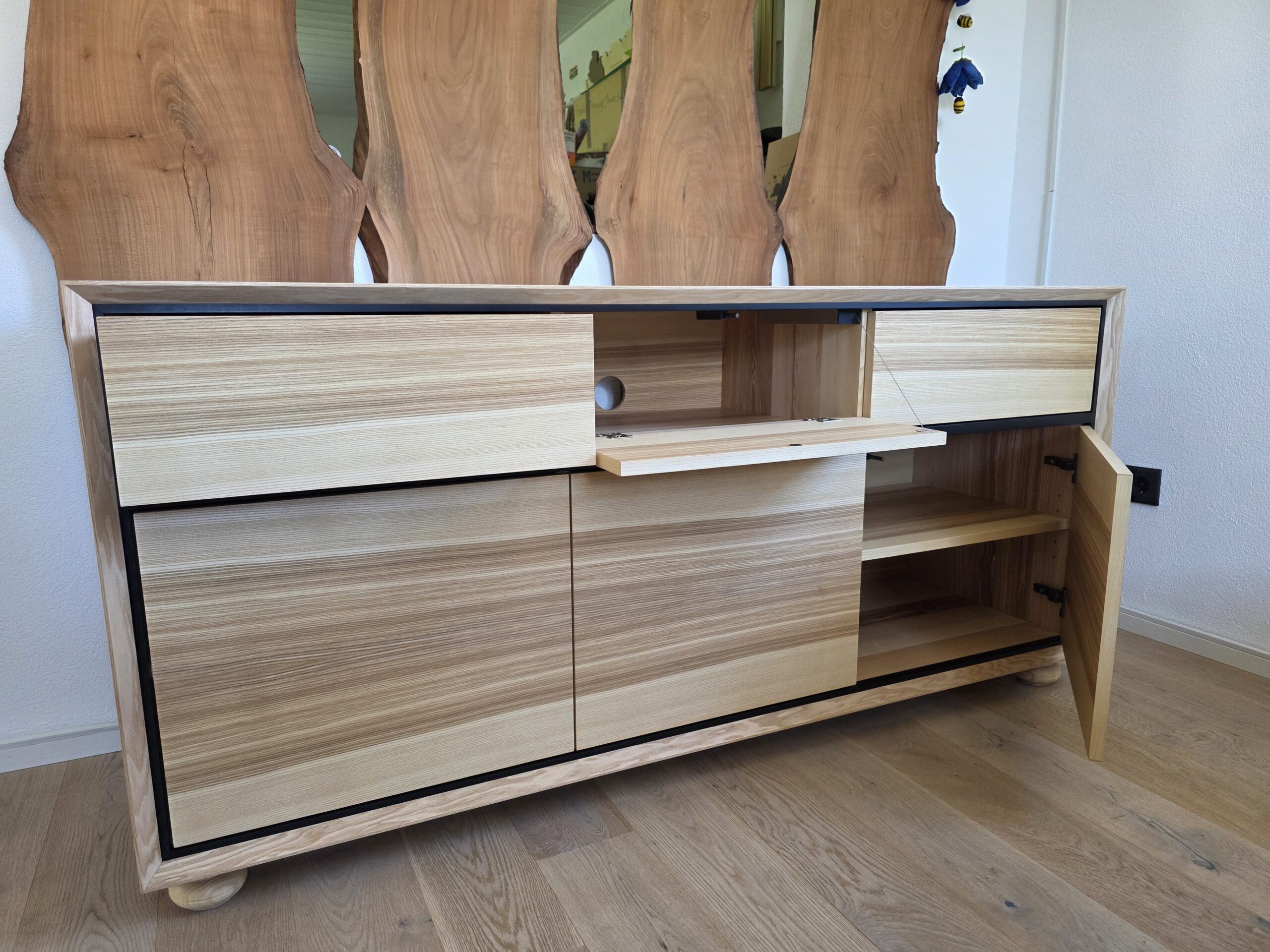 Maßgefertigtes Buffet aus massiver Esche mit umlaufendem Holzbild, Schweizer Kante, furnierten Fronten mit Furnierabwicklung, Schubkästen, Glastüren, Türen und Akzenten aus schwarz durchgefärbtem MDF. Oberfläche geölt.