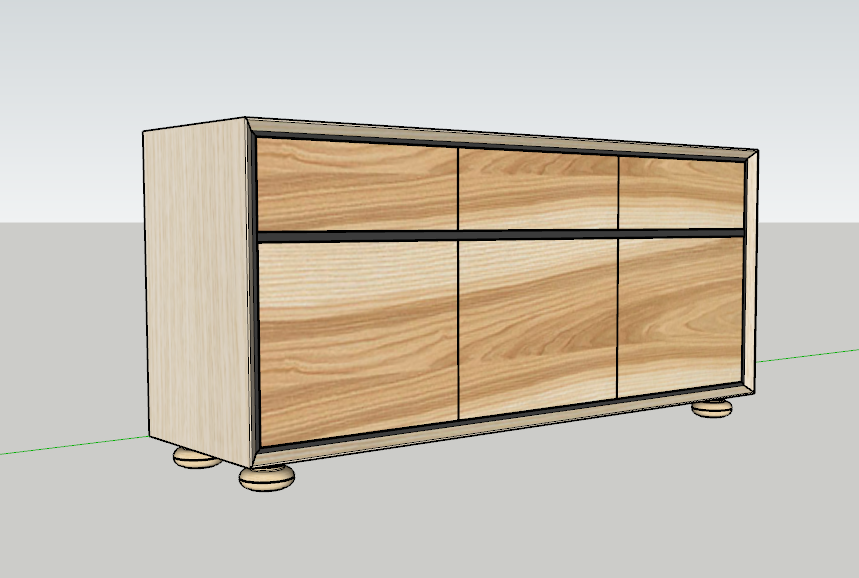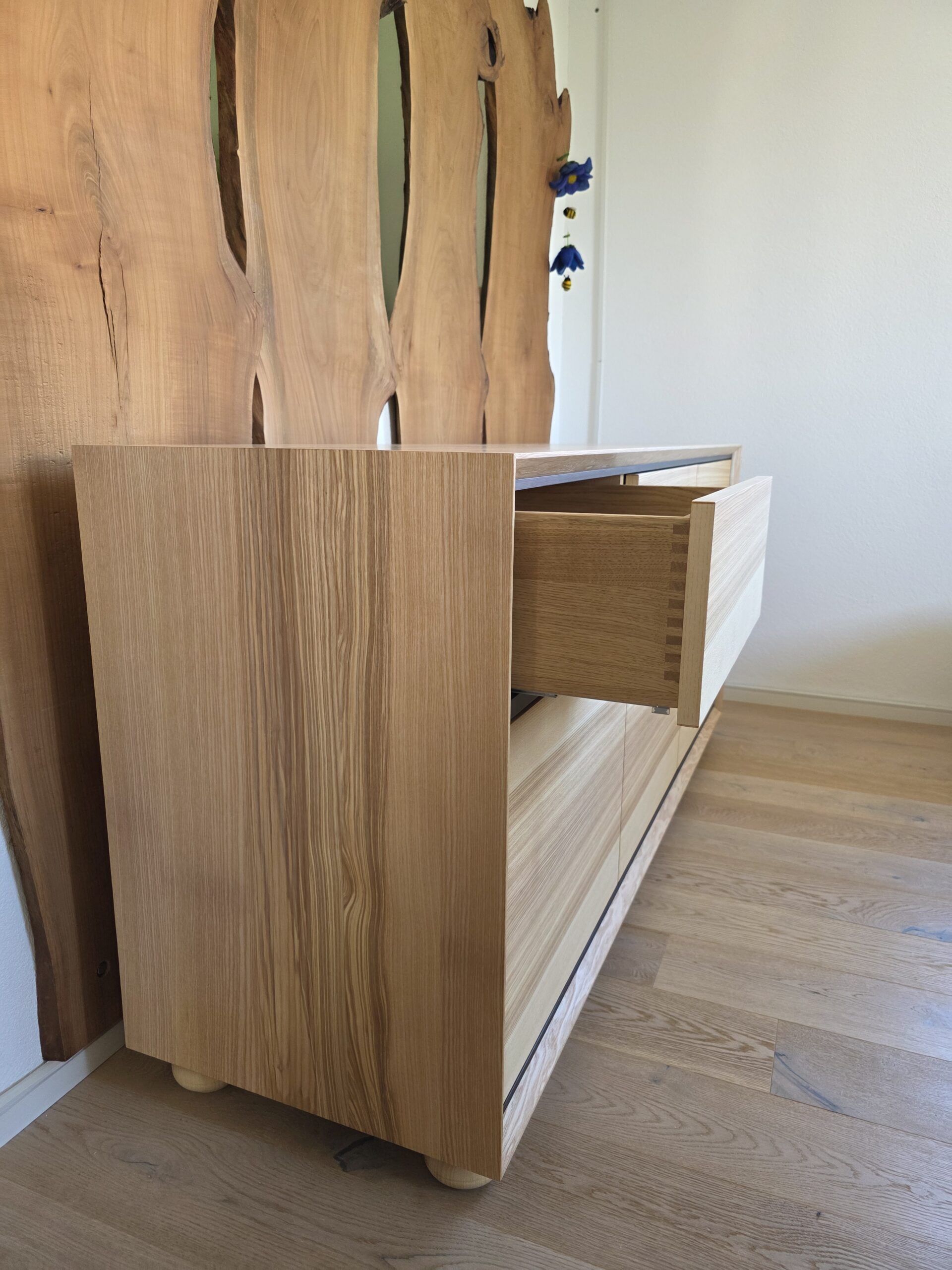 Der Korpus des TV-Boards besteht aus Esche Massivholz und wurde mit einer Schweizer-Kante ausgeführt um dem Korpus trotz der 36mm dicken Massivholzplatten eine gewisse Leichtigkeit und Eleganz zu verleihen. Die Fronten aus durchlaufend Echtholz furnierten Platten werden von schwarzen MDF Elemente umrahmt, die dem Möbel etwas modernes verleihen. Die Schubkästen sind aus Eiche Massivholz gezinkt und lassen sich per Tip-On grifflos öffnen. Beim Schließen der Schubkästen greift die Soft-Close-Funktion des Vollauszugs und garantiert ein sanftes Schließen. Zwischen den beiden Schubkästen befindet sich eine Klappe, hinter der die Stereoanlage ihren Platz findet. Im Unteren Bereich sind 3 Drehtüren verbaut, die sich ebenfalls grifflos öffnen lassen und durch die schwarzen Möbelbänder mit Einzugsdämpfer und Soft-Close-Funktion zurück in den geschlossenen Zustand mit 3mm Fugenluft gebracht werden. Die Füße des TV-Boards sind in Ungarn speziell für dieses Projekt gedrechselt worden und bringen traditionelle Elemente in das Möbel mit ein.