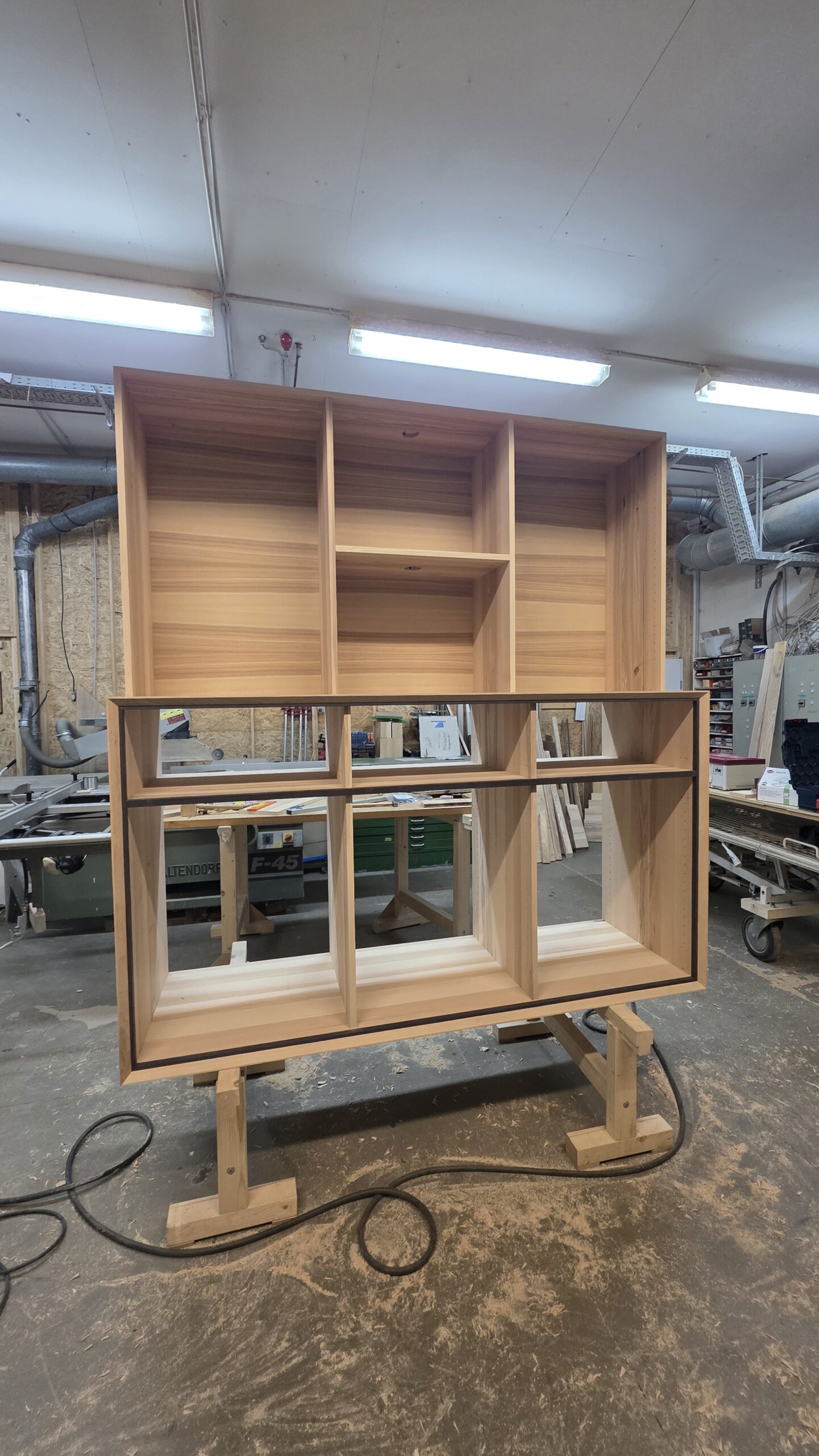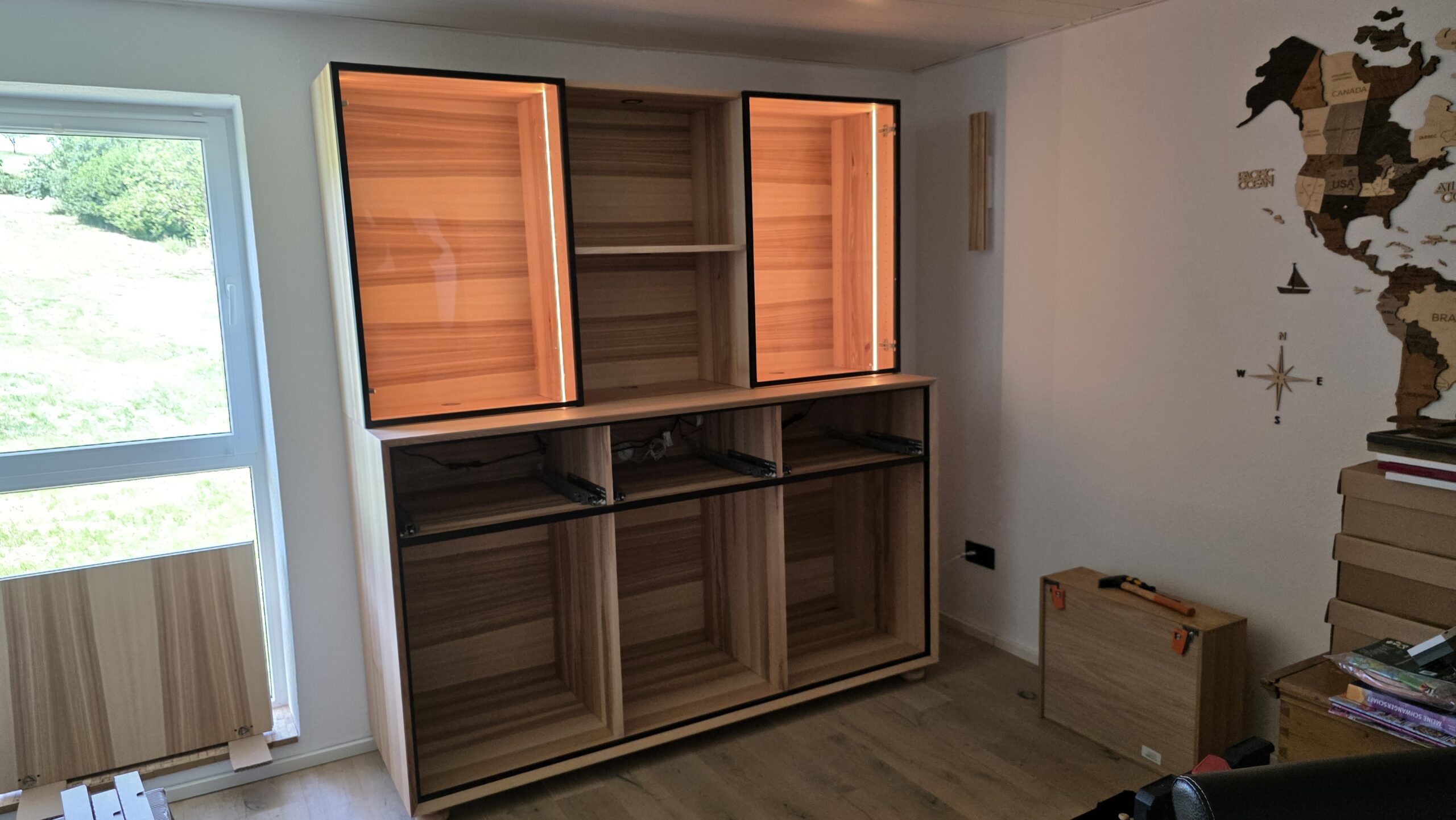 Wie das dazugehörige TV-Board wurde auch der Korpus des Buffets aus Esche Massivholz gefertigt und mit einer Schweizer-Kante versehen um dem Korpus trotz der 36mm dicken Massivholzplatten eine gewisse Leichtigkeit und Eleganz zu verleihen. Die Fronten sind auch hier aus durchlaufend Echtholz furnierten Platten und werden von schwarzen MDF Elementen umrahmt, die dem Möbel etwas modernes verleihen. Diese schwarze Rahmung wurde an den Glastüren wieder aufgegriffen, denn diese sind in schwarzen Aluminiumrahmen gefasst. Die Schubkästen sind wieder aus Eiche Massivholz gezinkt und lassen sich per Tip-On grifflos öffnen. Beim Schließen der Schubkästen greift die Soft-Close-Funktion des Vollauszugs und garantiert ein sanftes Schließen. Im Unteren Bereich sind 3 Drehtüren verbaut, hinter denen sich jeweils 2 Fachböden befinden. Die Füße des TV-Boards finden sich in diesem Stück auch wieder. In den oberen Fächern des Buffets sind vertikal verlaufende LED-Bänder eingelassen, die sich stufenlos dimmen lassen und für eine herrliche ambiente Beleuchtung sorgen und die warmen Holzfarben zur Geltung bringen. Der obere Teil des Möbels ist vom unteren Teil lösbar, damit das Möbel transportiert werden kann, falls nochmal umgezogen wird.