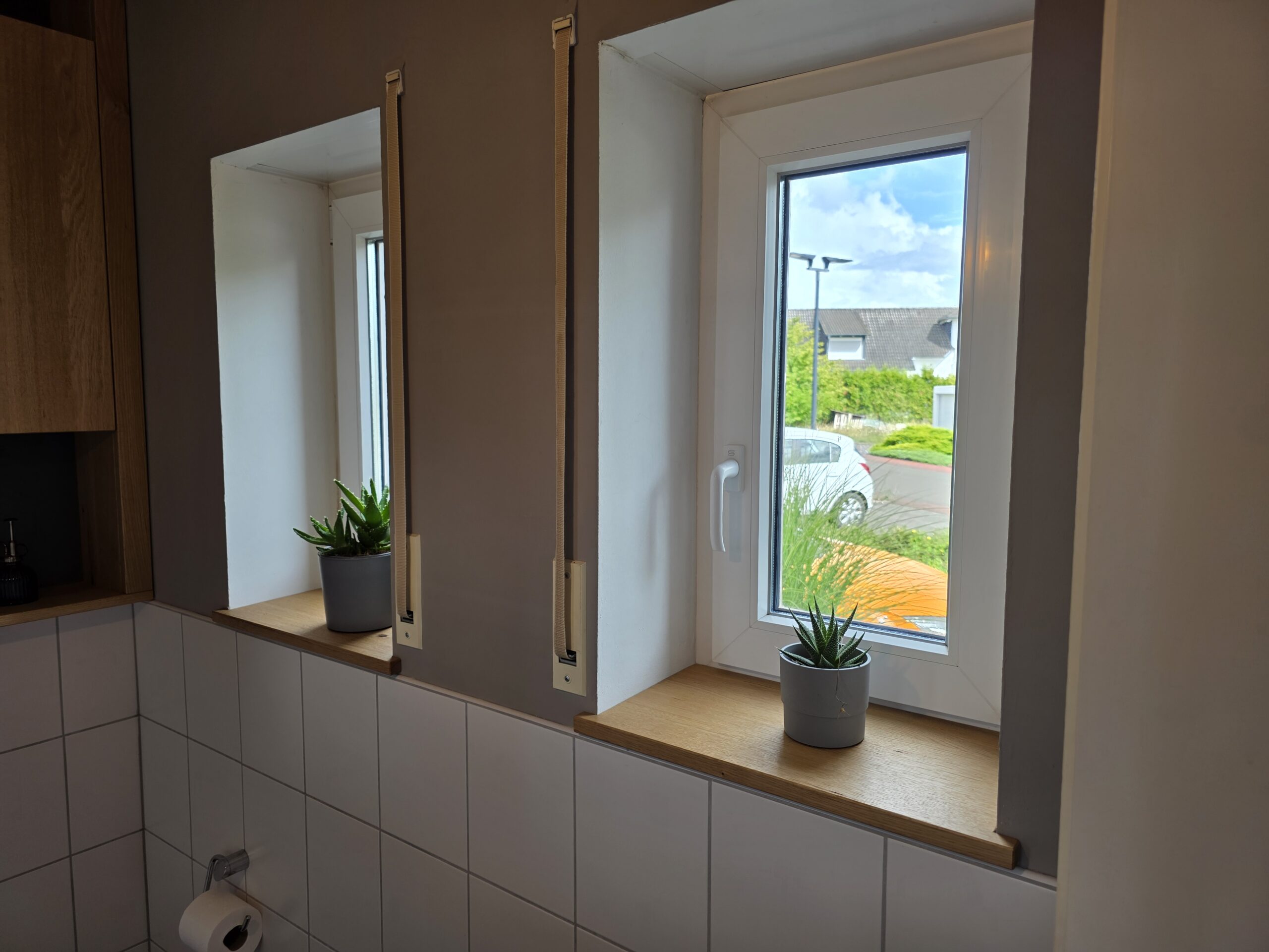Badezimmermöbel aus Eiche Massivholz, mit passendem Waschtisch und Fensterbänken. Oberfläche geölt.