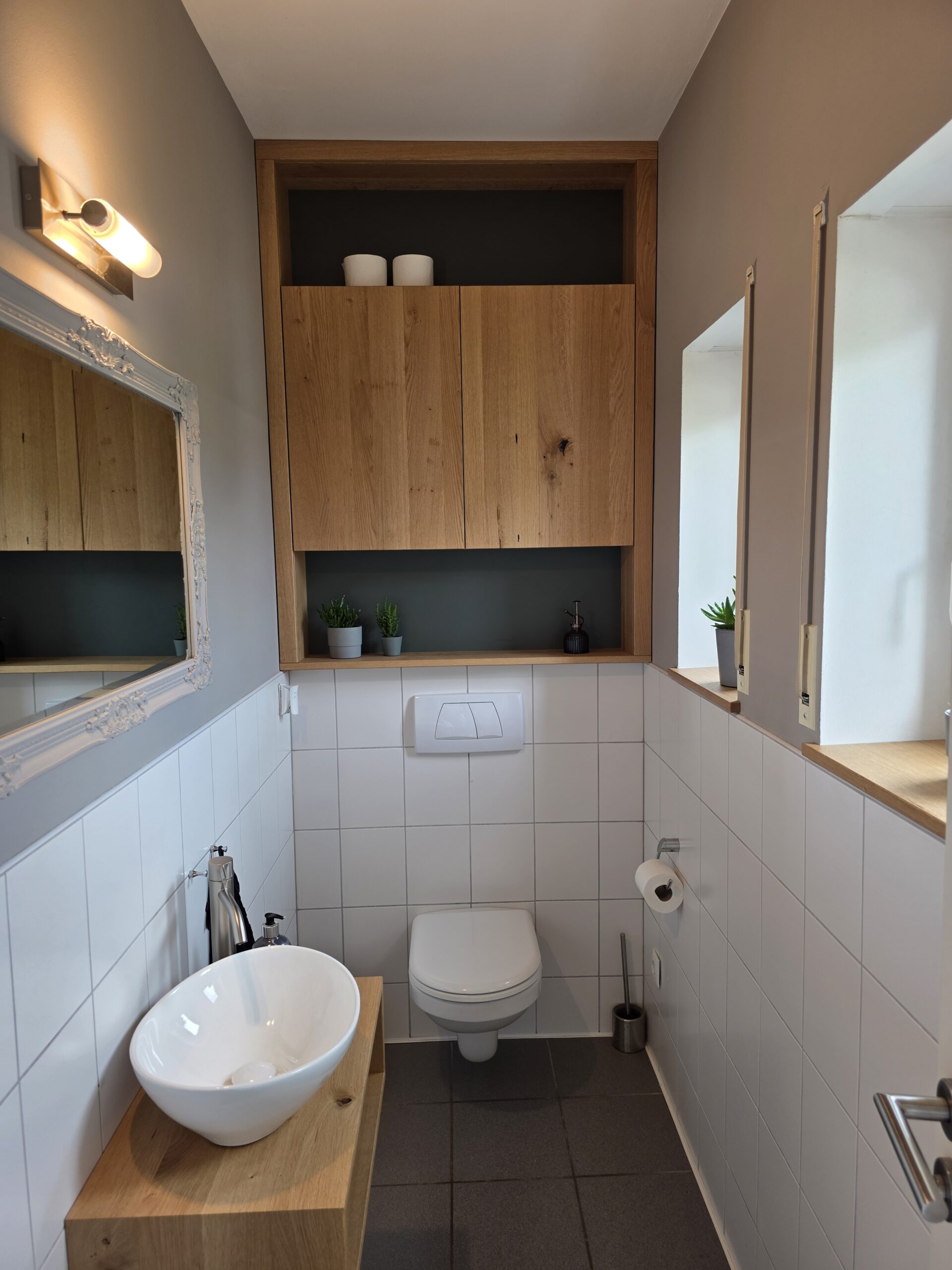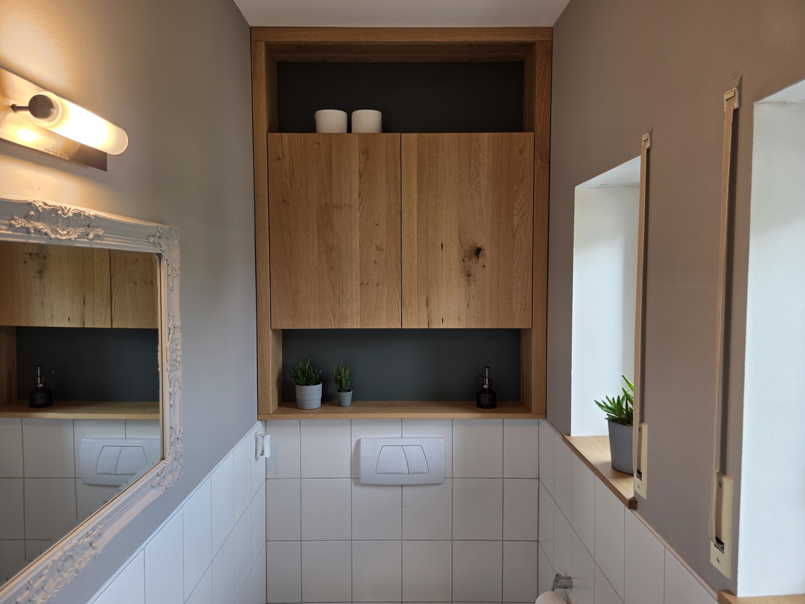 Dieses Möbelstück haben wir aus dem Massivholz gefertigt, das dem Kunden vererbt wurde. Das Schränkchen hat 2 grifflose Drehtüren aus Eiche, welche von hinten mit Gratleisten aus Eiche gegen das Arbeiten des Holzes gesichert wurden um langfristig ein sauberes Fugenbild und sauberes Schließen zu gewährleisten. Über und unter den Türen stehen nochmal 2 Böden als Staufläche zur Verfügung. Die Rückwand des Möbels ist aus einer melaminbeschichteten Platte in einem dunklen Grünton und harmoniert ganz toll mit der warmen, leicht rötlichen Eiche. Durch die sauber angepassten Passleisten rechts, links und oben, sieht das Möbel (sogar ohne Acryl) aus wie in den Raum gegossen. Passend zum Schrank haben wir auch einen Waschtisch aus Eiche gefertigt, dieser ist auf Gehrung verleimt und aus einem Stück gefertigt, wodurch die Maserung des Holzes ohne Unterbrechung um das Möbel verläuft. Dazu noch Eiche Fensterbänke und schon ist aus dem ehemals trostlosen Gäste-WC einer der schönsten Räume im Haus geworden.