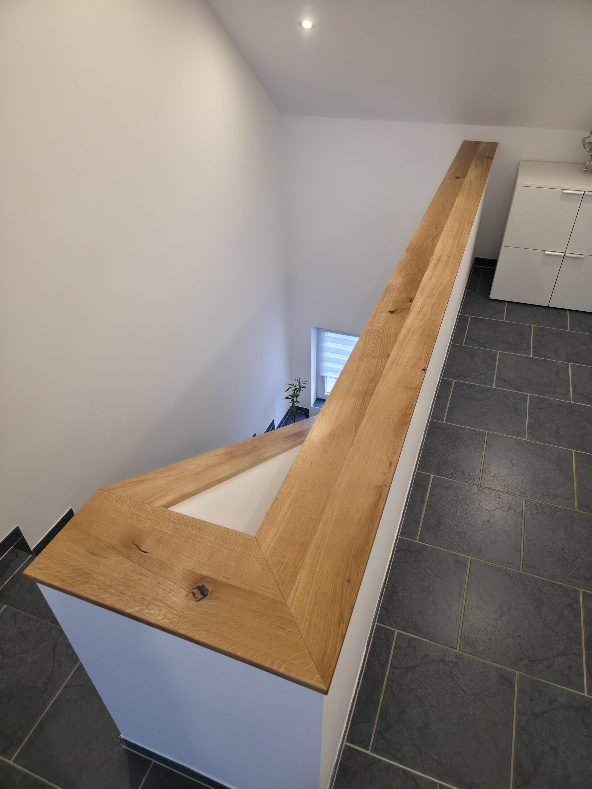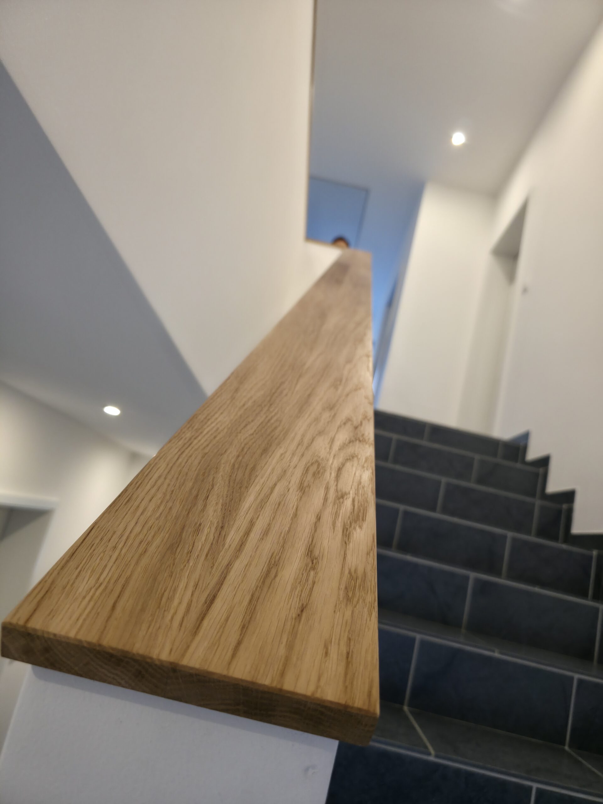 Diese elegante Brüstungsabdeckung ist in Eiche Massivholz gefertigt und die Oberfläche mit einem Hartwachsöl veredelt. Die Äste und Risse der Wildeiche wurden mit schwarzer Spachtelmasse gefüllt. Nach unten wurde die Abdeckung zur Mauer hin mit Acryl versiegelt.