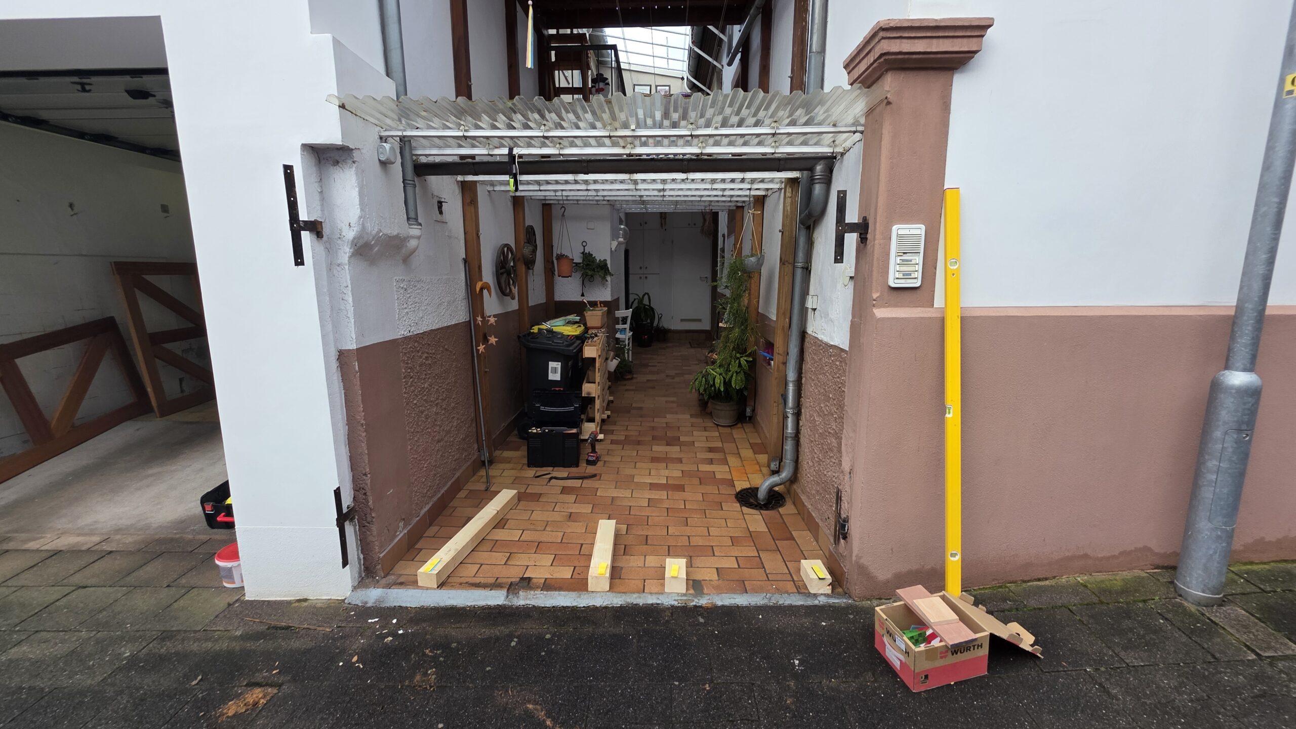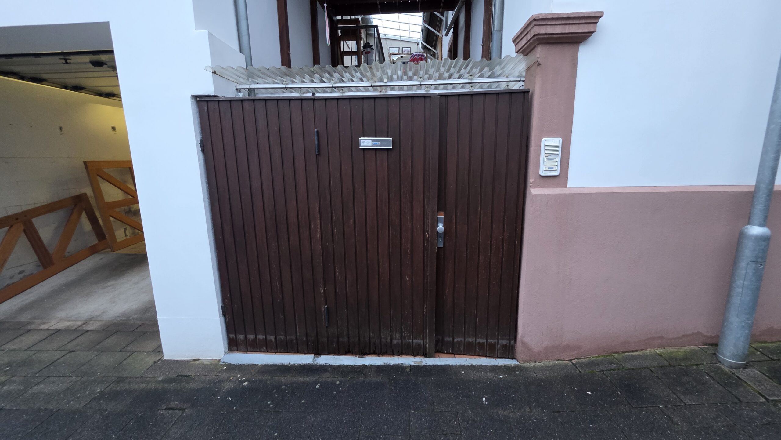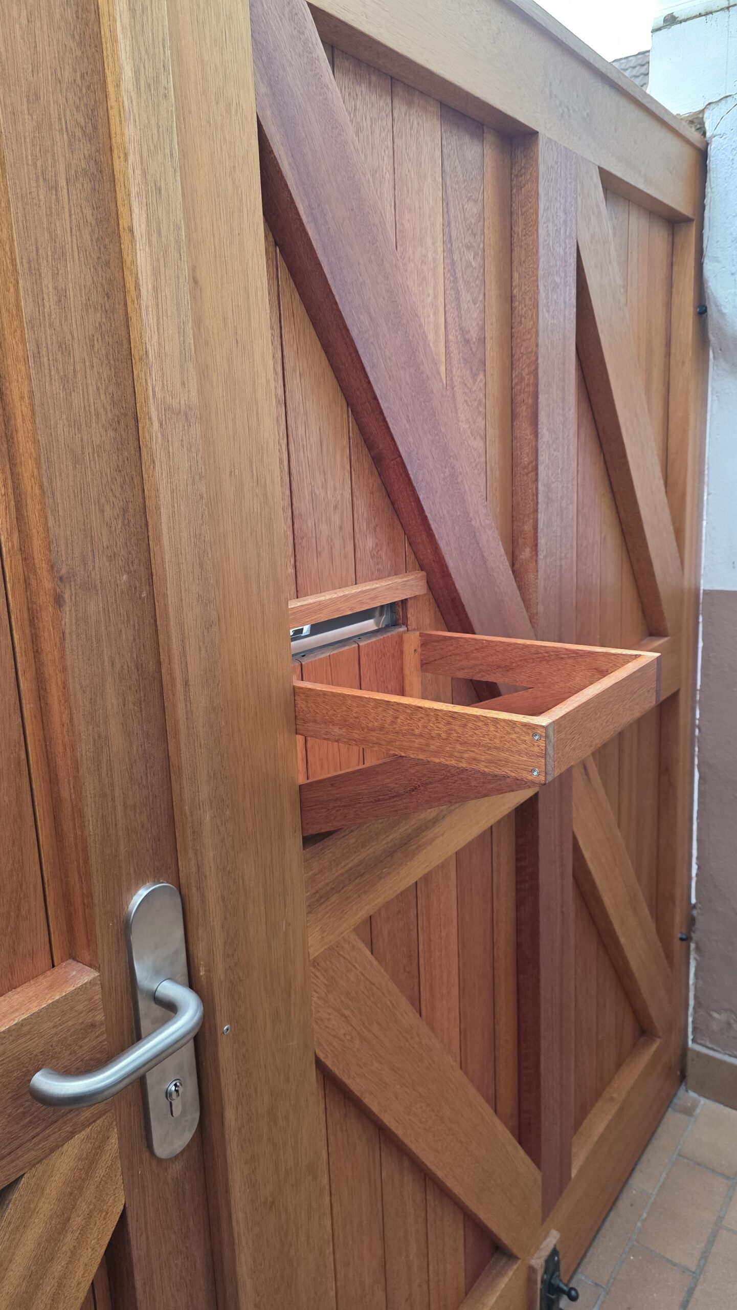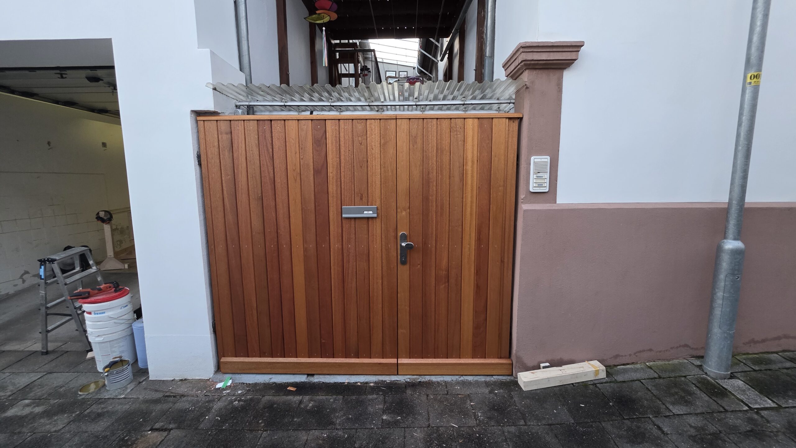 Dieses Hoftor haben wir aus Meranti – einem Holz das typischerweise häufig im Fensterbau verwendet wird – gefertigt. Es besteht aus einem Gehflügel und einem breiteren Bedarfsflügel. Für die Zuhaltung des Bedarfsflügel haben wir Elemente vom zuvor verbauten Tor übernommen, der Gehflügel fällt ins Schloss wie eine gute Haustür und verriegelt über 3 Verriegelungspunkte. Von außen ist ein Wetterschenkel für den konstruktiven Holzschutz montiert, zu diesem Zweck wurde auch eine 2-seitig schräg geschnittene Leiste an der Oberkante der beiden Torflügel montiert. Die Oberfläche des Tors ist mit einer Dünnschichtlasur behandelt. Für Briefe und Zeitungen haben wir einen Einwurfschlitz eingelassen und einen kleinen Holzkorb montiert, der die Post auffängt.