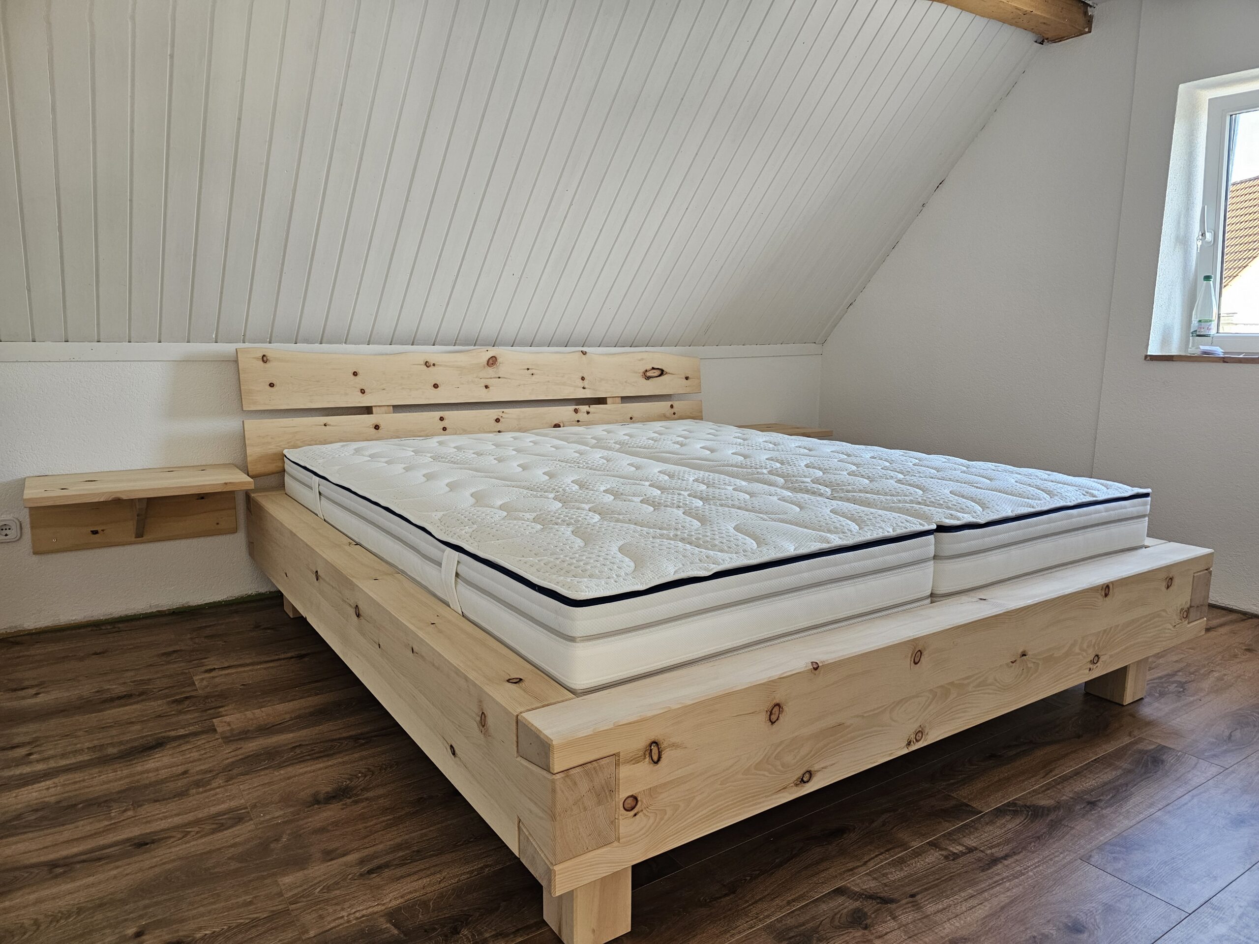 Das Holz ist reich an ätherischen Ölen, welche die Entspannung fördern und somit den Schlaf verbessern sollen. Zusätzlich sorgen diese Öle für einen wunderbar angenehmen Duft, weshalb die Oberfläche des Bettes mit einer speziellen Zirbelseife behandelt wurde, um die Holzporen nicht zu verschließen und langfristig von dem Duft und den positiven Effekten des Holzes zu profitieren. Passend zum Bett wurden noch 2 Nachttische aus Zirbelkiefer rechts und links an der Wand montiert.